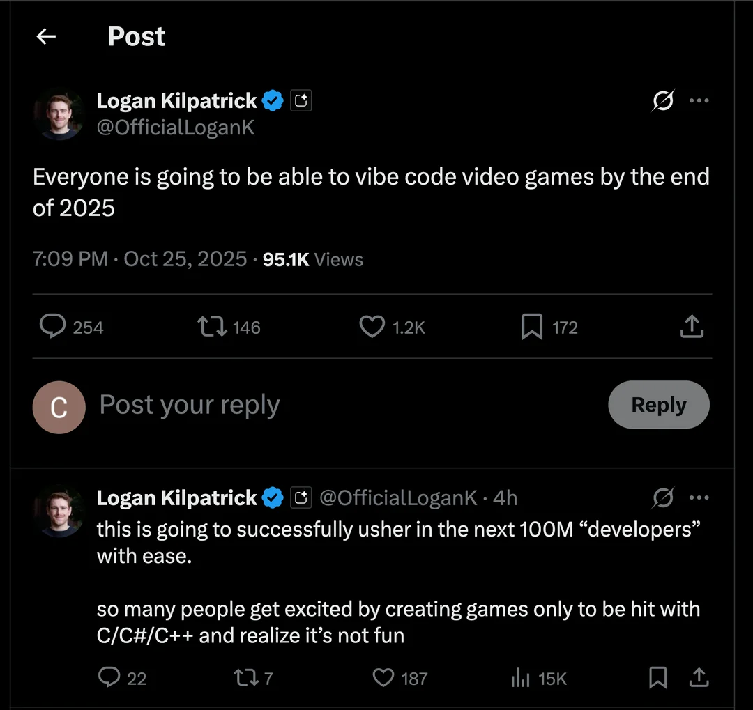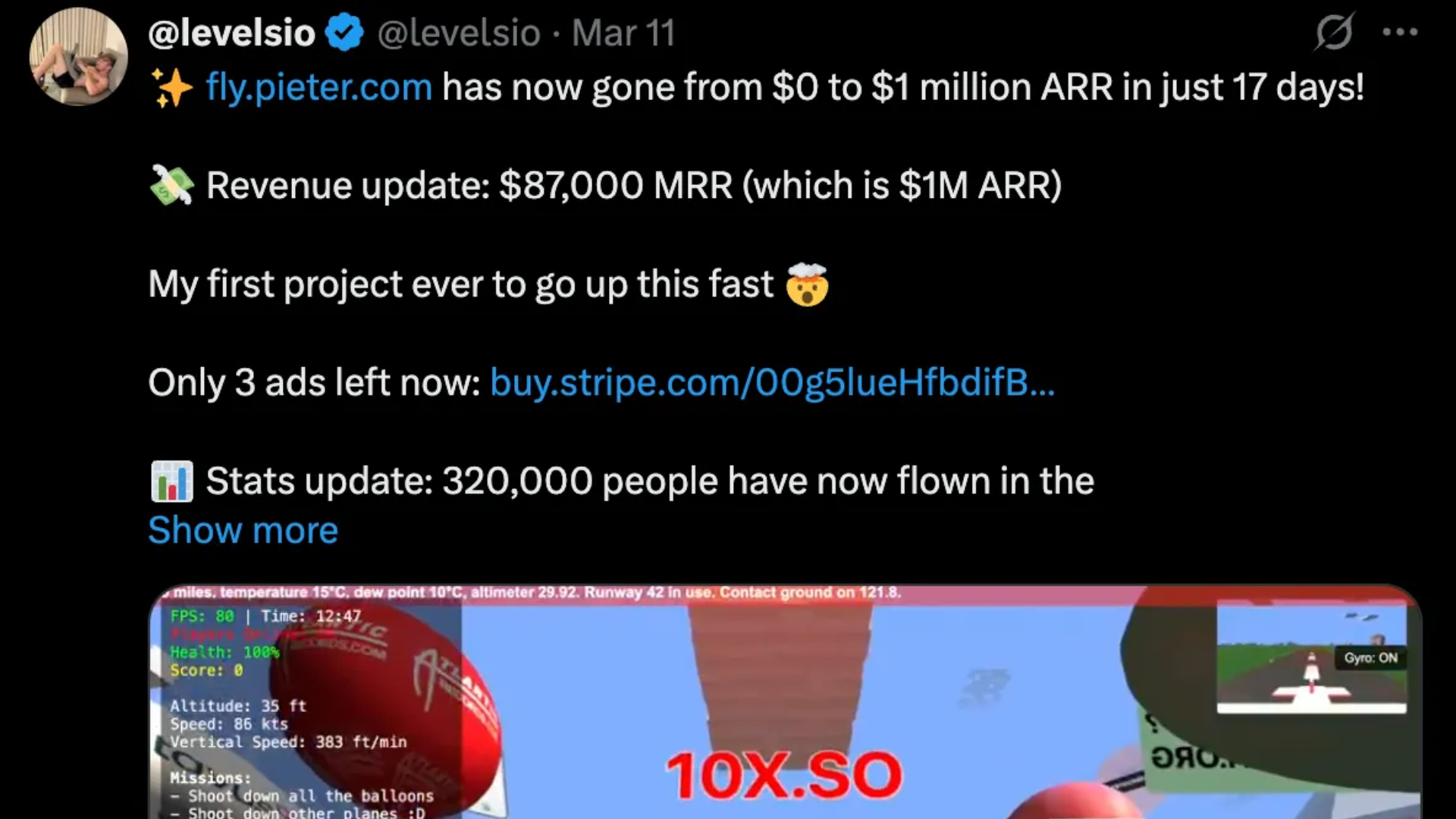 Even with current AI tech we’ve already had massive success stories — like Pieter Levels who vibe coded a flight simulator in 3 hours — and went on to make over $1 million in a year.
