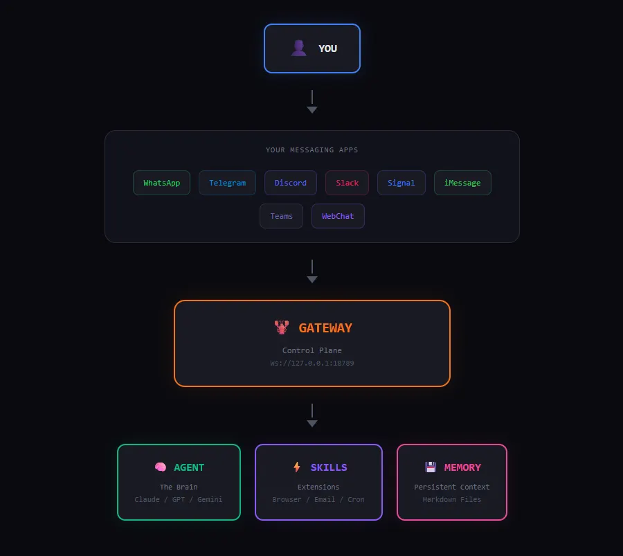 The gateway connects that agent to your chat apps and skills. It routes messages from WhatsApp or Slack to your local assistant, lets it run tools, and sends the reply back to you.
