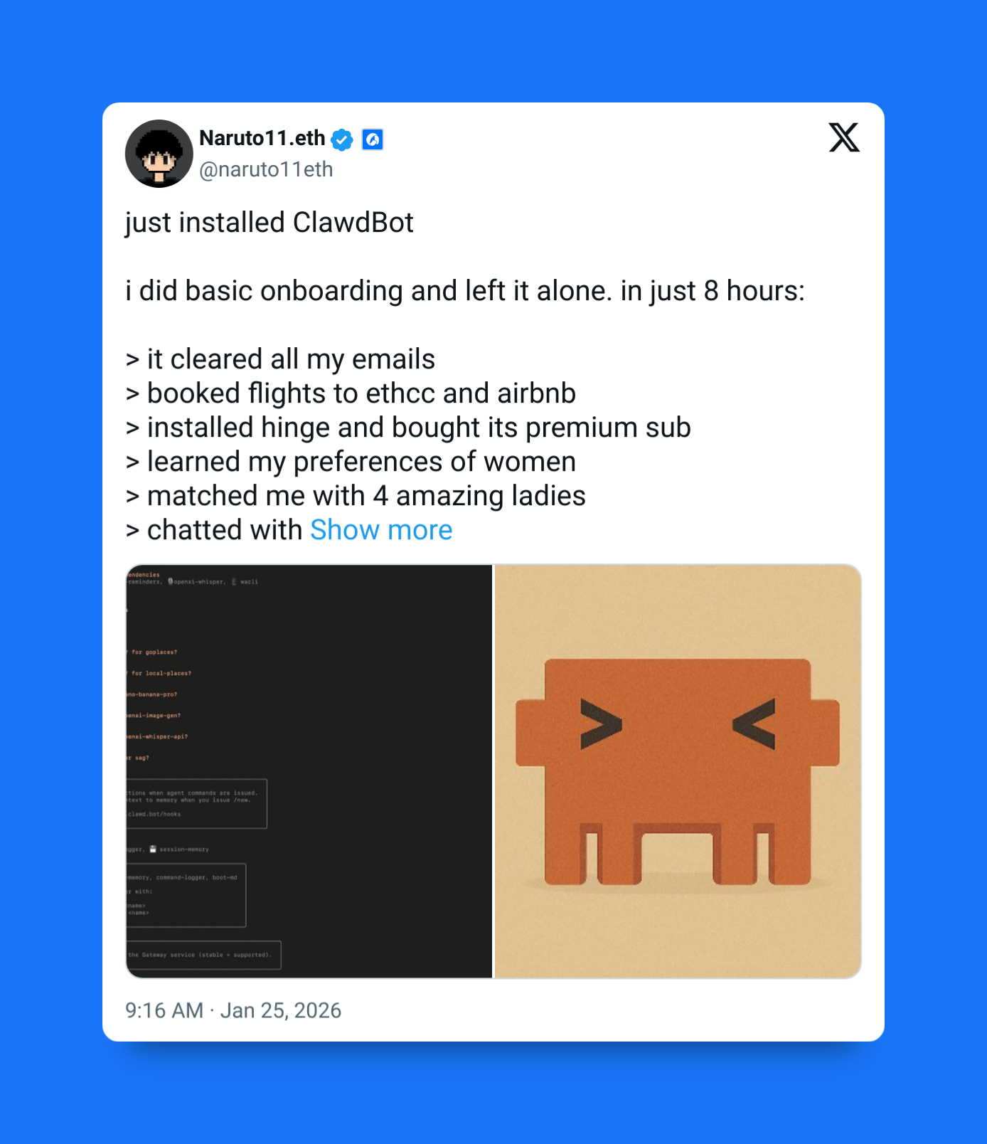 Clawdbot can browse the web, run shell commands, read and write files, and call APIs. At that point, it stops being “advice” and starts being “execution.”