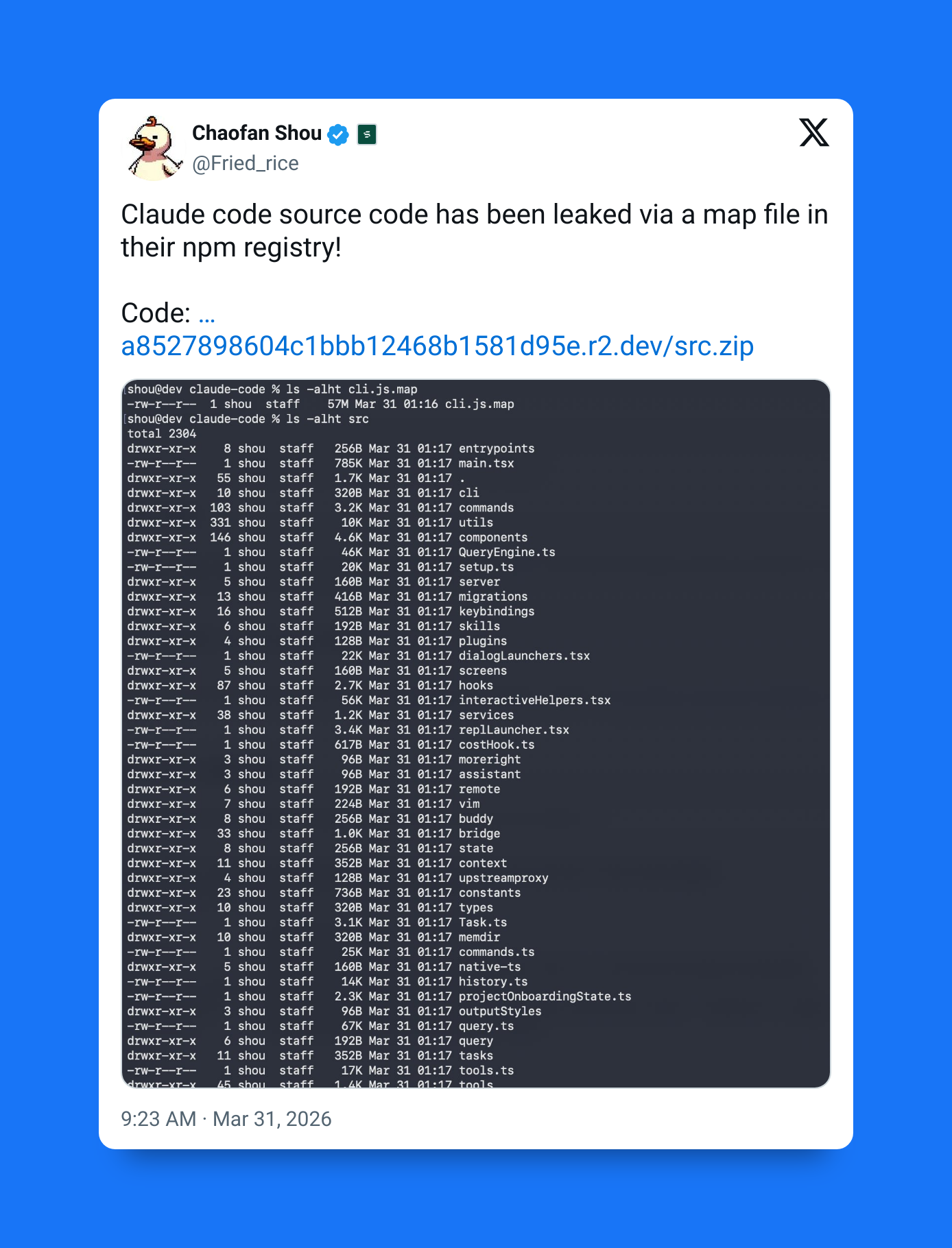 The leak originated from npm release @anthropic-ai/claude-code version 2.1.88.
