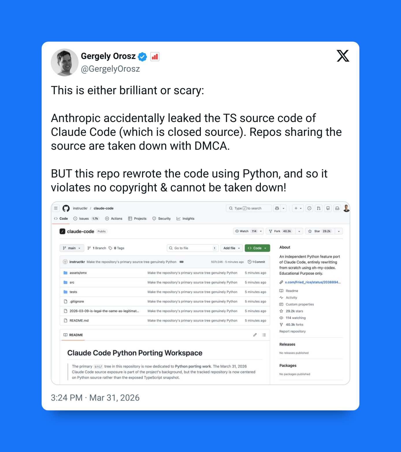By rewriting the entire logic in a whole different language, it made it much harder for Anthropic to have a solid legal basis to for a takedown: